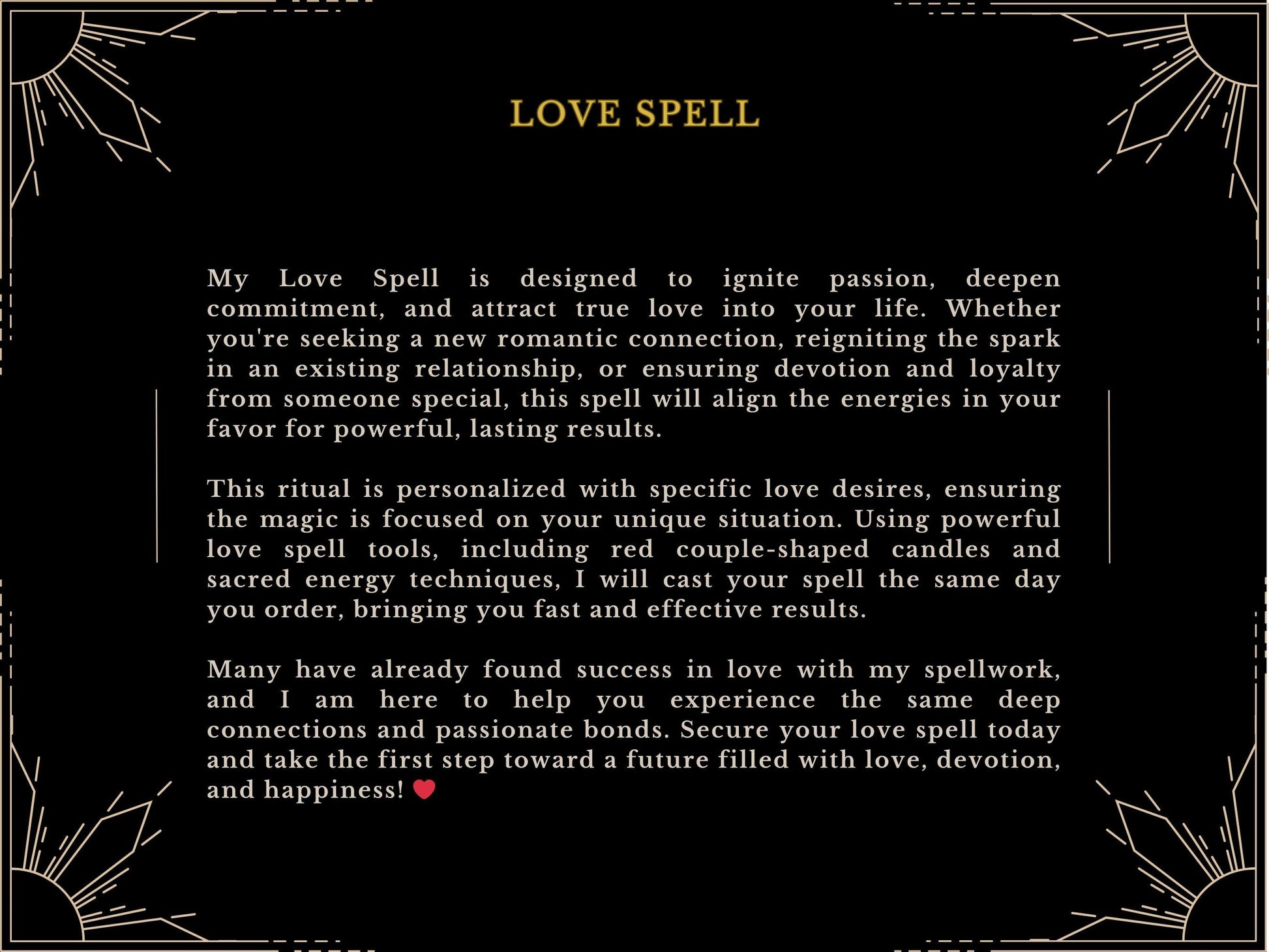 i am motherodessa, a trusted spiritual guide and spellcaster, here to help you find the love, passion, and commitment you desire. my love spell is designed to ignite passion, deepen emotional bonds, and inspire intense attraction. whether you want to attract a new love, strengthen an existing relationship, or ensure devotion and loyalty from your special person, this spell will align the energies in your favor.