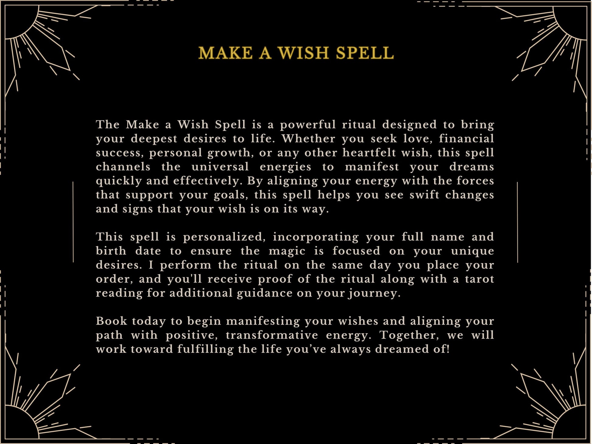 MAKE A WISH SPELL Wish Granting Spell Fulfill Your Deepest Desires and Have Your Wish Granted Done by MotherOdessa’s Powerful Wish Granting ________________________________________________________________________________________________________________________ 🌟 Manifest Your Heart’s Desires with the Power of a Wish Granting Spell 🌟 Greetings, Dear Seeker, I am MotherOdessa, a trusted spiritual guide and spellcaster, here to help you fulfill your deepest wishes and manifest the life you dream of. My **Make a Wish Spell** is a powerful ritual designed to grant your wishes and bring your desires into reality. Whether you're looking for love, success, or any other desire, this spell channels the energies needed to manifest your wishes quickly and effectively. 🔮 What My Make a Wish Spell Offers 🔮 - **Wish Fulfillment:** Bring your deepest desires to life by invoking the magic of manifestation. - **Powerful Energy Alignment:** Align your energy with the universal forces that support your goals and wishes. - **Quick Results:** See your wishes start to manifest in your life swiftly and with clear signs. - **Personalized Magic:** Each spell is tailored to you, ensuring that the energy focuses specifically on your unique desires. ✨ Why Choose My Make a Wish Spell? ✨ - **Tailored for You:** This spell is uniquely crafted based on your personal wishes. Your full name and date of birth are included to ensure that the magic is focused specifically on your desires. - **Strong Ritual Tools:** I use powerful candles, sacred herbs, and energy-clearing techniques to support your wish and help it manifest. - **One-Card Tarot Reading:** In addition to the spell, you will receive a personalized tarot reading to provide insights into your journey and help you understand the energies surrounding your wish. - **Same-Day Casting:** I understand the urgency of your desires, and I offer same-day spell casting for quick results. 🌑 How the Make a Wish Spell Works 🌑 1. **Purchase the Spell:** Secure your spot for this powerful and personalized ritual. 2. **Provide Your Details:** Share your full name, date of birth, and the specific wish or desire you want to fulfill. 3. **Experience the Ritual:** I will perform the ritual using your details to channel the energies necessary for your wish to manifest. 4. **Receive Proof & Insights:** Within hours, you will receive a personalized tarot reading along with photographic proof of the ritual. 🌍 Who Can Benefit? 🌍 - **Those Seeking to Manifest a Desire:** Whether your wish is for love, success, financial growth, or any other goal, this spell can help bring it into reality. - **People Ready for Positive Change:** If you are ready for a new chapter in your life, this spell will help align you with the energy needed to make it happen. - **Spiritual Seekers:** If you are looking to tap into powerful energy for wish fulfillment, this spell will guide you in the right direction. 🌟 Why Choose Me? 🌟 - **Generational Expertise:** My abilities as a spellcaster are based on ancient traditions passed down through generations, making my magic strong and effective. - **Compassionate Service:** I take great care with each wish, ensuring that your desires are respected and manifested with the utmost respect and attention. - **Proven Success:** Many have experienced their wishes coming true after receiving this spell, and I continue to be trusted by clients seeking transformation in their lives. 🌿 How to Get Started 🌿 1. **Purchase the Spell:** Secure your same-day casting spot for this transformative ritual. 2. **Provide Your Details:** Share your full name, date of birth, and your specific wish or desire. 3. **Receive Proof & Insights:** Within hours, you will receive the tarot reading and proof of your ritual along with personalized insights on your journey. ✨ Limited Spots Available Daily – Book Now to Manifest Your Wishes! ✨ Thank you for trusting me to help you manifest the life you desire. Together, we will channel the magic of the universe to bring your wishes into reality. With blessings, MotherOdessa ________________________________________________________________________________________________________________________