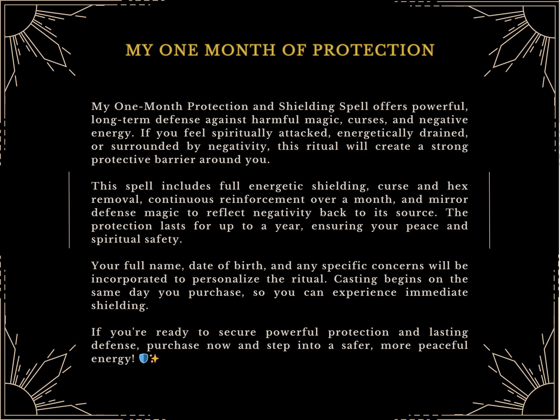 One Month of Protection and Shielding Spell castings and defense against harmful magic, curses, and hexes for one year by motherodessa ________________________________________________________________________________________________________________________ 🛡️ powerful protection and shielding spell for long-term defense 🛡️ greetings, dear seeker, are you feeling energetically drained, attacked, or surrounded by negativity? do you sense harmful magic, curses, or hexes affecting your life? my one-month protection and shielding spell castings are designed to create a powerful, long-lasting spiritual defense to shield you from negative forces. this ritual strengthens your aura, repels harmful energies, and safeguards your well-being, ensuring peace and protection for up to a year. whether you are experiencing psychic attacks, jealousy, or bad luck, this powerful magic will help you regain control and live free of spiritual burdens. 🔮 what my protection ritual includes 🔮 - **full energetic shielding** – a strong spiritual barrier will be placed around you, preventing harmful magic from taking effect. - **curse and hex removal** – eliminates lingering negative energies that may be affecting your life. - **continuous spell reinforcement** – performed over an entire month to ensure long-lasting results, providing protection for up to one year. - **mirror defense magic** – any negative energy, evil eye, or harmful intentions sent your way will be reflected back to its source. - **one-card tarot reading** – a personal tarot reading offering insights into your current spiritual protection and guidance on maintaining it. - **same-day casting** – your spell will begin immediately after purchase to start working as soon as possible. ✨ who can benefit from this ritual? ✨ - those who feel under psychic or magical attack - individuals experiencing bad luck, misfortune, or unexplained obstacles - those targeted by jealousy, envy, or negative energy from others - anyone who wants to maintain a strong, protective spiritual barrier for long-term safety 🕯️ how this works 🕯️ 1. **purchase the ritual** – secure your protection and shielding spell casting. 2. **provide your details** – share your full name, date of birth, and any specific concerns. 3. **experience the ritual** – i will perform the spell over one month, strengthening your protection for a full year. 4. **receive insights** – you will receive a one-card tarot reading offering additional guidance on your spiritual protection. 🛡️ why choose my spellwork? 🛡️ - **ancestral expertise** – my knowledge of protection magic has been passed down through generations, ensuring effective and ethical spellwork. - **ongoing reinforcement** – unlike a one-time spell, this ritual provides continuous protection over a full month to ensure lasting results. - **compassionate guidance** – i truly care about my clients and will offer support throughout your protection journey. - **safe and ethical magic** – i only work with positive, white magic to ensure your well-being and protection. 🌿 how to get started 🌿 1. purchase the ritual to begin your journey toward protection and peace. 2. send your full name, date of birth, and details of any specific concerns. 3. i will perform the ritual over one month, ensuring your protection is strong and long-lasting. 4. you will receive a personalized tarot reading with insights into your protective energy. ✨ limited spots available daily – book now for immediate shielding and defense! ✨ thank you for allowing me to guide and protect you on this journey. together, we will ensure your spiritual safety and peace of mind. with blessings, motherodessa ________________________________________________________________________________________________________________________