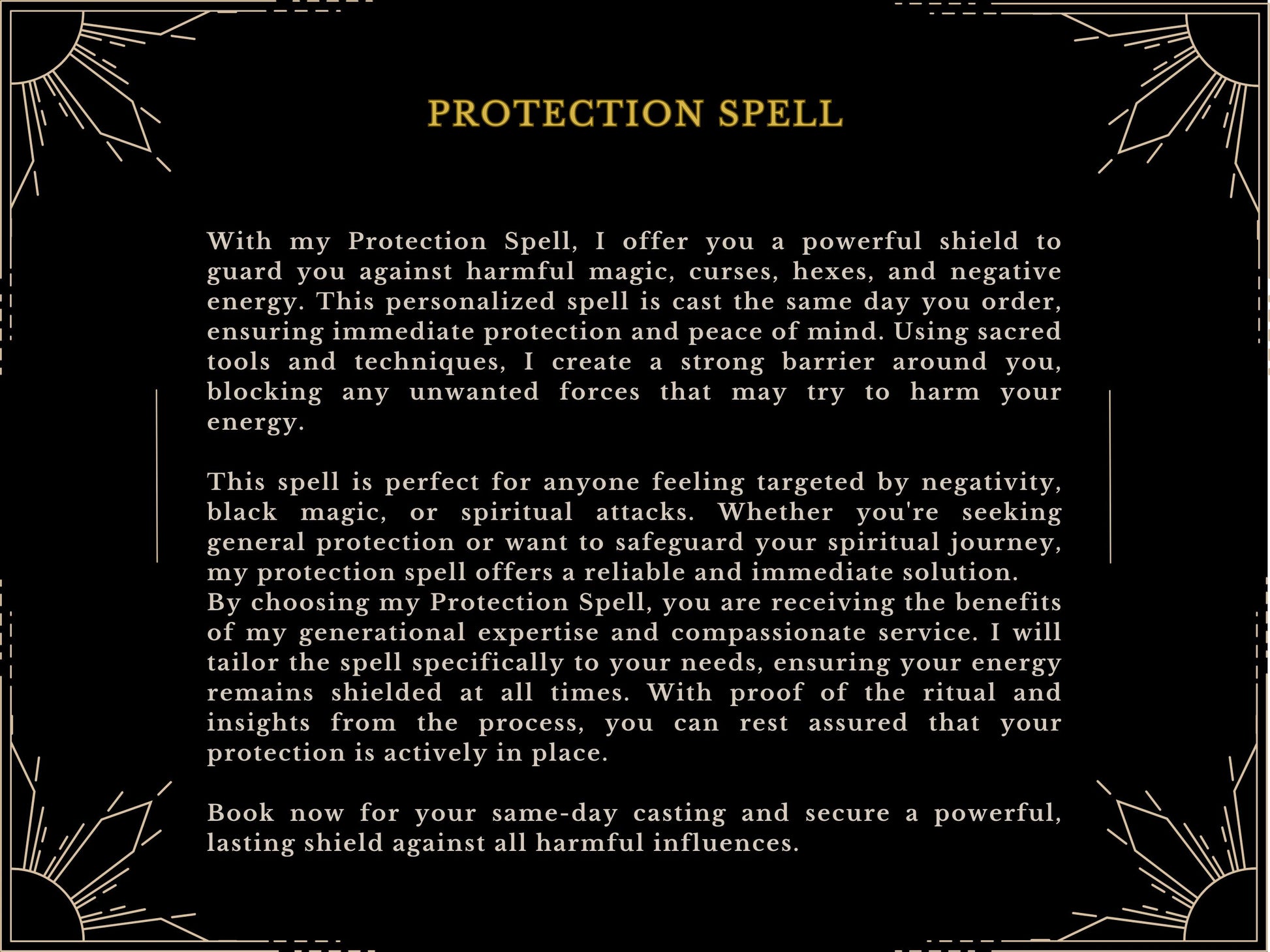 - Same-Day Casting: Your protection is urgent, and I will cast the spell the same day you purchase, ensuring immediate results.
