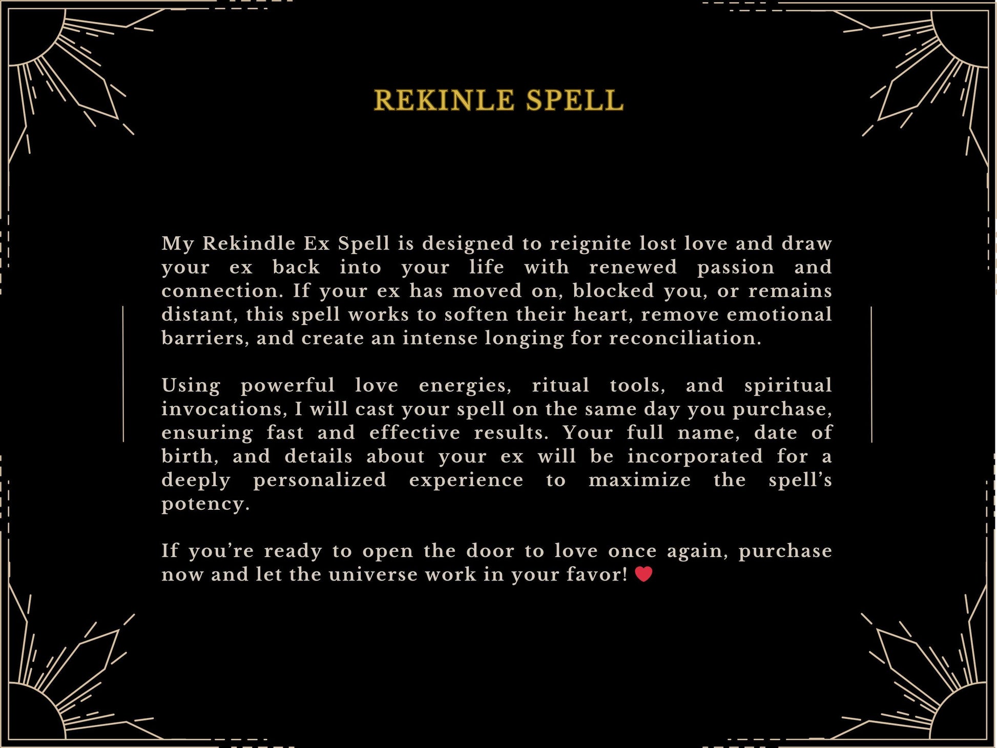 have you been longing for your ex to return? do you feel like thereโs unfinished business between you two? my rekindle ex spell is designed to help reignite lost love, dissolve emotional barriers, and draw your ex back to you. whether your ex has moved on, blocked you, or is being stubborn, this spell is crafted to reawaken their feelings and guide them back into your life.